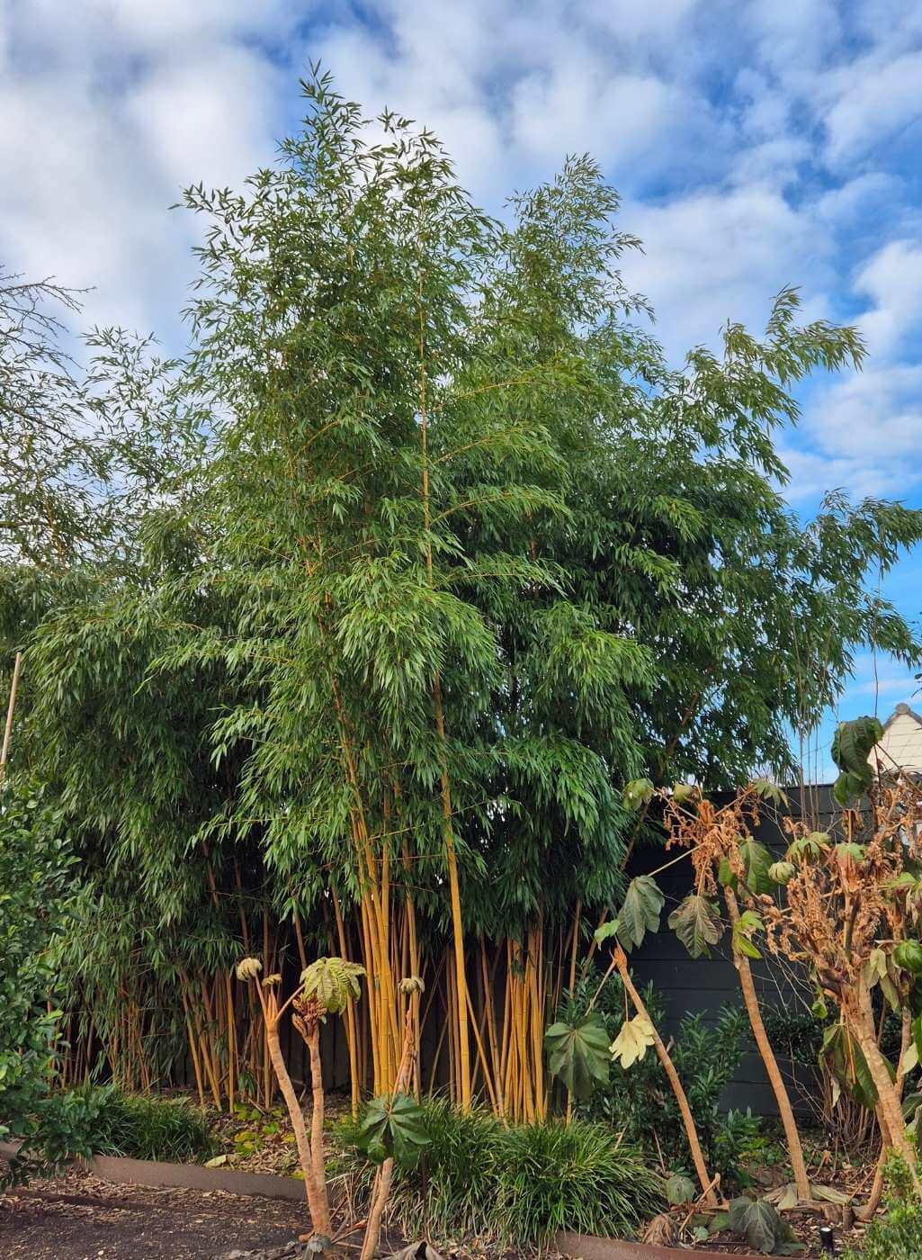 Les chaumes de ce bambou magnifique arborent une belle teinte jaune dorée, particulièrement visible en automne, au moment où les nouvelles pousses printanières ont atteint leur pleine hauteur. Lorsque ce bambou est planté dans un emplacement exposé à la lumière directe du soleil venant du sud ou de l’ouest, les chaumes développent souvent un reflet magenta lumineux pendant une courte période au printemps, ce qui lui confère un caractère vraiment spectaculaire. Il s’agit du bambou le plus résistant au froid parmi toutes les variétés à chaumes jaunes ou dorés. C’est une espèce véritablement unique et remarquable, qui se distingue tout particulièrement en début d’été, lorsque les nouvelles pousses affichent leurs couleurs les plus vives et les plus lumineuses. Comme toutes les espèces de Phyllostachys, ce bambou présente un port dressé et élancé, ce qui en fait un élément architectural de premier choix dans tout jardin. Que ce soit en tant que plante solitaire imposante ou comme haie végétale, le Phyllostachys vivax ‘Aureocaulis’ est un véritable atout paysager. Attention toutefois : en tant que bambou traçant, l’installation d’une barrière anti-rhizomes est fortement recommandée pour maîtriser son développement.